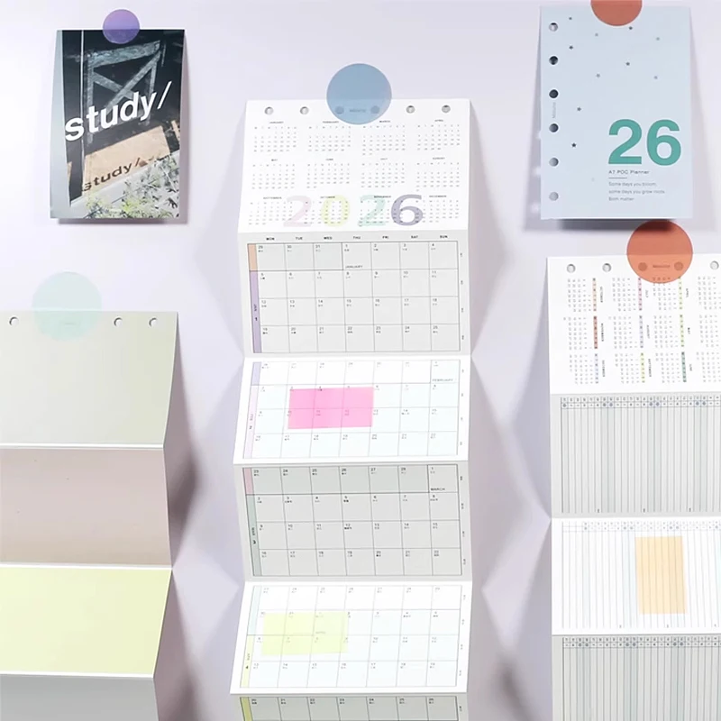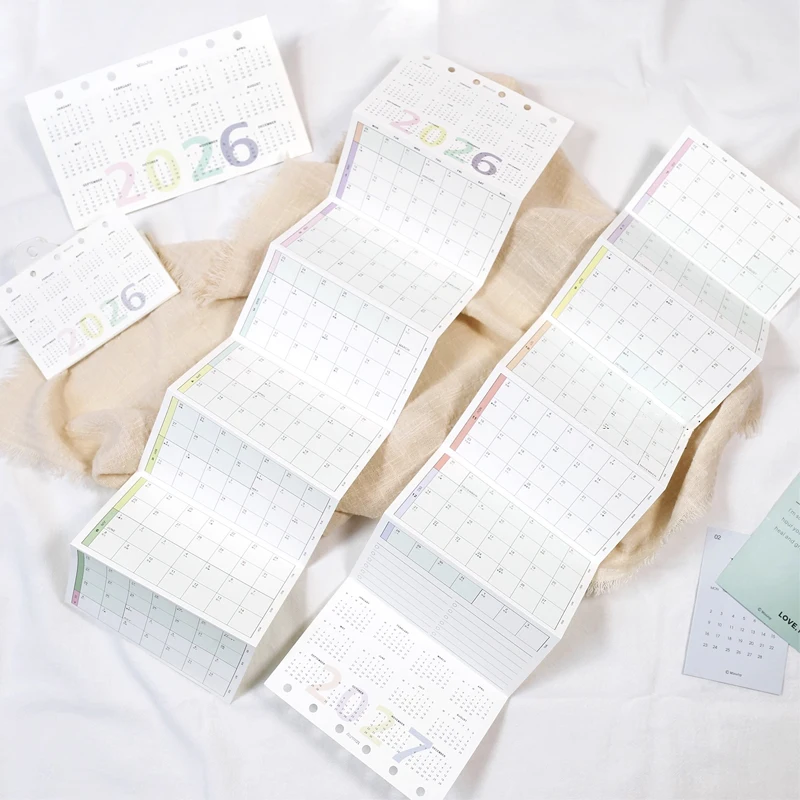2026 A6 A7 M5 Colorful Yearly Monthly Planner Refills with Calendar 8 Fold Design 6 Ring Loose Leaf Paper