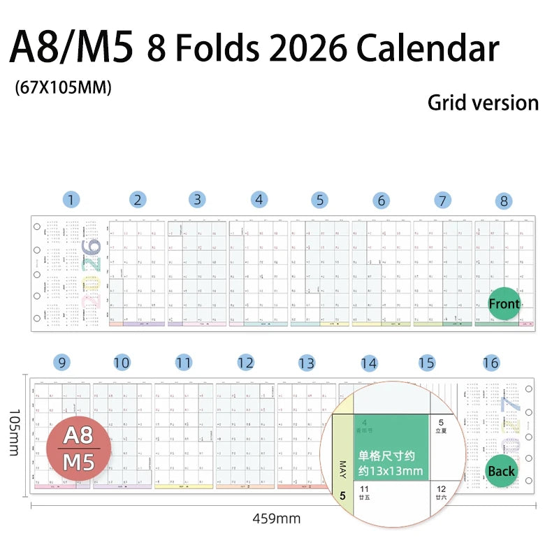 Fromthenon 2026 Calendar A6 A7 M5 Colorful Yearly Monthly Planner Refills with Calendar 8 Fold Design 6 Holes Loose Leaf Paper